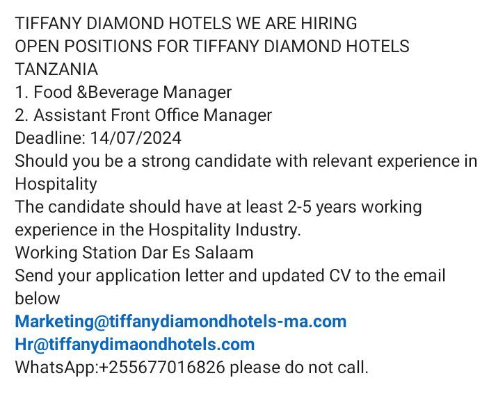 July 12, 2024 Recruiter Assistant Front Office Manager Discover more from Ajira Tanzania| Nafasi za Kazi Tanzania| FG Subscribe to get the latest posts sent to your email. Type your emailโฆ Subscribe Share this: Click to share on X (Opens in new window) X Click to share on Facebook (Opens in new window) Facebook Click to email a link to a friend (Opens in new window) Email Click to share on WhatsApp (Opens in new window) WhatsApp Click to share on X (Opens in new window) X Like Loading...