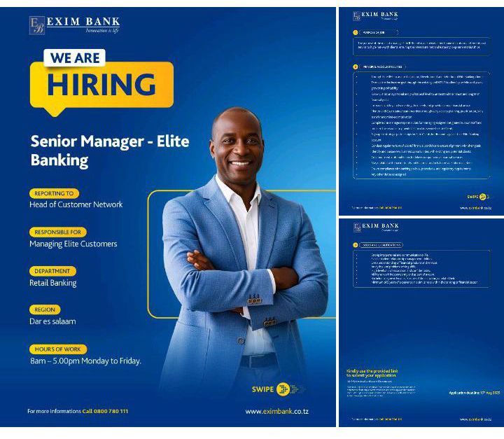 August 7, 2025 Recruiter Senior Manager- Elite Banking Deadline: 15 August, 2025 Discover more from Ajira Tanzania| Nafasi za Kazi Tanzania| FG Subscribe to get the latest posts sent to your email. Type your emailโฆ Subscribe Share this: Click to share on X (Opens in new window) X Click to share on Facebook (Opens in new window) Facebook Click to email a link to a friend (Opens in new window) Email Click to share on WhatsApp (Opens in new window) WhatsApp Click to share on X (Opens in new window) X Like Loading...