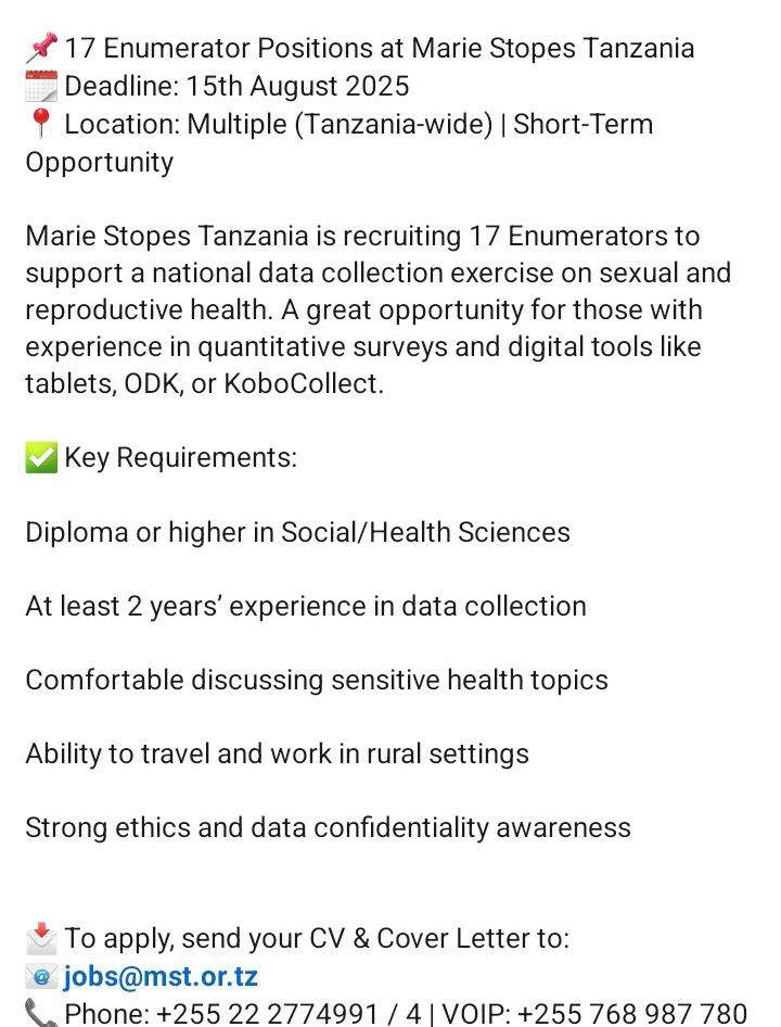 August 9, 2025 Recruiter Enumerators Deadline: 15 August 2025 Discover more from Ajira Tanzania| Nafasi za Kazi Tanzania| FG Subscribe to get the latest posts sent to your email. Type your emailโฆ Subscribe Share this: Click to share on X (Opens in new window) X Click to share on Facebook (Opens in new window) Facebook Click to email a link to a friend (Opens in new window) Email Click to share on WhatsApp (Opens in new window) WhatsApp Click to share on X (Opens in new window) X Like Loading...