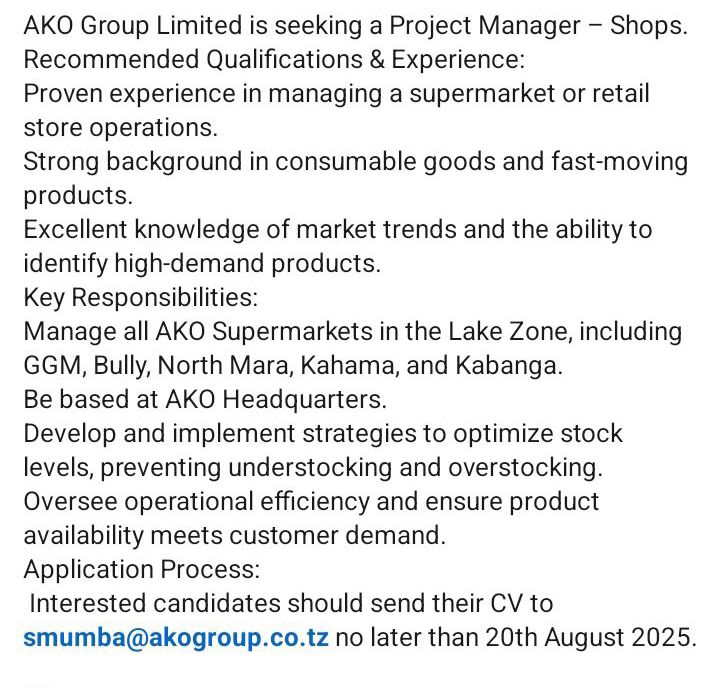 August 11, 2025 Recruiter Project Manager – Shops Job location: 20 August, 2025 Discover more from Ajira Tanzania| Nafasi za Kazi Tanzania| FG Subscribe to get the latest posts sent to your email. Type your emailโฆ Subscribe Share this: Click to share on X (Opens in new window) X Click to share on Facebook (Opens in new window) Facebook Click to email a link to a friend (Opens in new window) Email Click to share on WhatsApp (Opens in new window) WhatsApp Click to share on X (Opens in new window) X Like Loading...