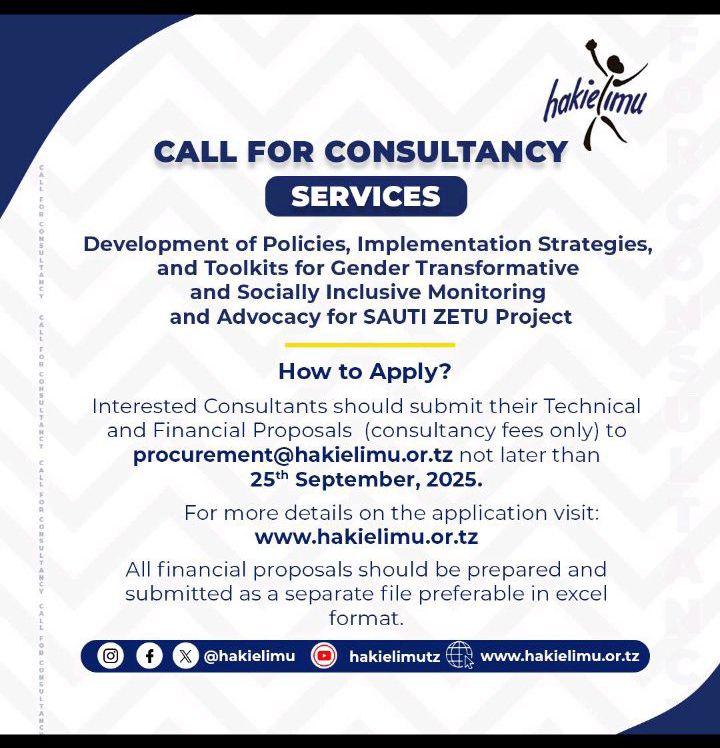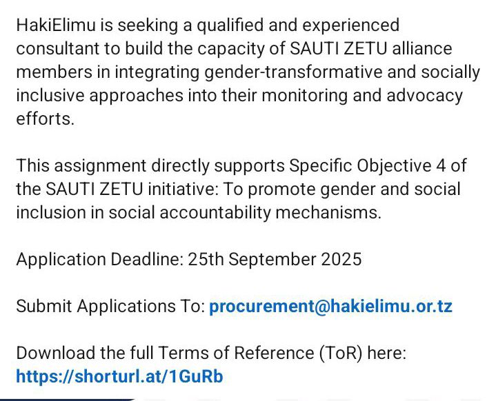 September 15, 2025 Recruiter Tender: Consultant – to build capacity of Sauti Zetu Alliance Members Deadline: 25th September, 2025 Discover more from Ajira Tanzania| Nafasi za Kazi Tanzania| FG Subscribe to get the latest posts sent to your email. Type your emailโฆ Subscribe Share this: Click to share on X (Opens in new window) X Click to share on Facebook (Opens in new window) Facebook Click to email a link to a friend (Opens in new window) Email Click to share on WhatsApp (Opens in new window) WhatsApp Click to share on X (Opens in new window) X Like Loading...