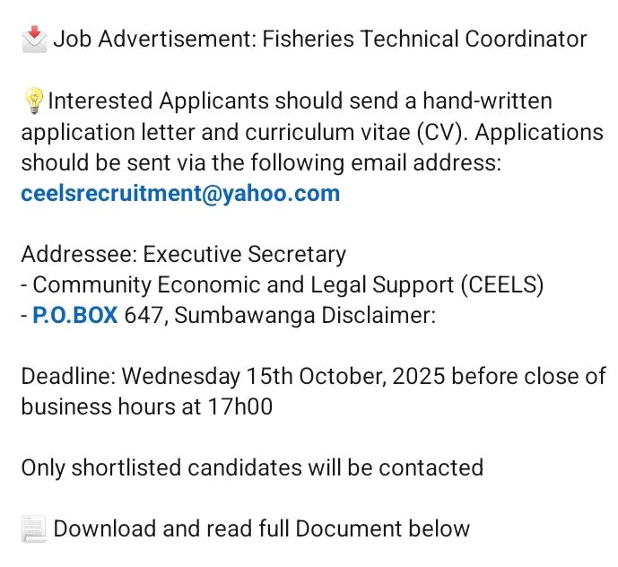 October 13, 2025 Recruiter Fisheries Technical Coordinator Submit application Discover more from Ajira Tanzania| Nafasi za Kazi Tanzania| FG Subscribe to get the latest posts sent to your email. Type your emailโฆ Subscribe Share this: Click to share on X (Opens in new window) X Click to share on Facebook (Opens in new window) Facebook Click to email a link to a friend (Opens in new window) Email Click to share on WhatsApp (Opens in new window) WhatsApp Click to share on X (Opens in new window) X Like Loading...
