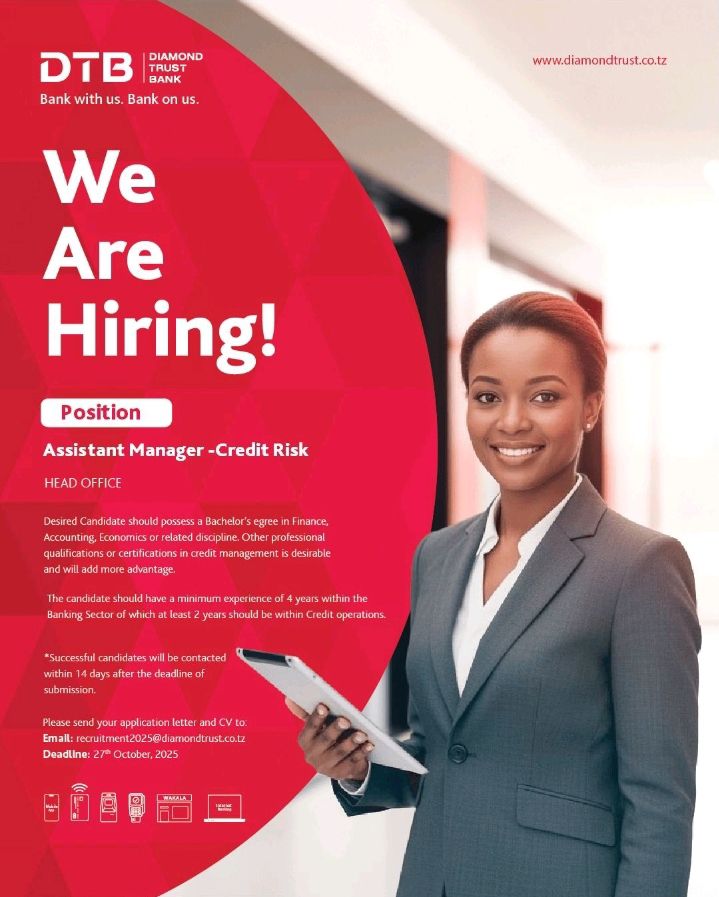 October 15, 2025 Recruiter Assistant Manager: Credit Risk Discover more from Ajira Tanzania| Nafasi za Kazi Tanzania| FG Subscribe to get the latest posts sent to your email. Type your emailโฆ Subscribe Share this: Click to share on X (Opens in new window) X Click to share on Facebook (Opens in new window) Facebook Click to email a link to a friend (Opens in new window) Email Click to share on WhatsApp (Opens in new window) WhatsApp Click to share on X (Opens in new window) X Like Loading...