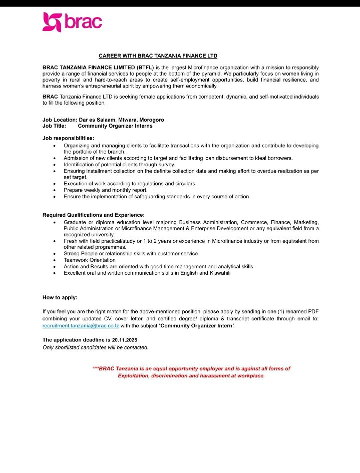 November 8, 2025 Recruiter Internship: Community Organizers Discover more from Ajira Tanzania| Nafasi za Kazi Tanzania| FG Subscribe to get the latest posts sent to your email. Type your emailโฆ Subscribe Share this: Click to share on X (Opens in new window) X Click to share on Facebook (Opens in new window) Facebook Click to email a link to a friend (Opens in new window) Email Click to share on WhatsApp (Opens in new window) WhatsApp Click to share on X (Opens in new window) X Like Loading...