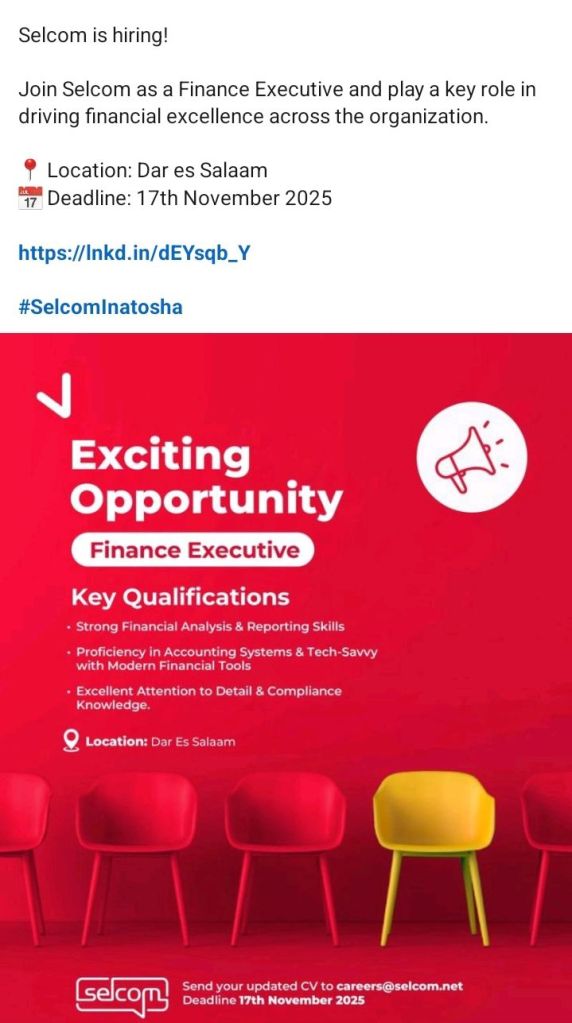 November 10, 2025 Recruiter Business Development Officers Submit application Click here Discover more from Ajira Tanzania| Nafasi za Kazi Tanzania| FG Subscribe to get the latest posts sent to your email. Type your emailโฆ Subscribe Share this: Click to share on X (Opens in new window) X Click to share on Facebook (Opens in new window) Facebook Click to email a link to a friend (Opens in new window) Email Click to share on WhatsApp (Opens in new window) WhatsApp Click to share on X (Opens in new window) X Like Loading...