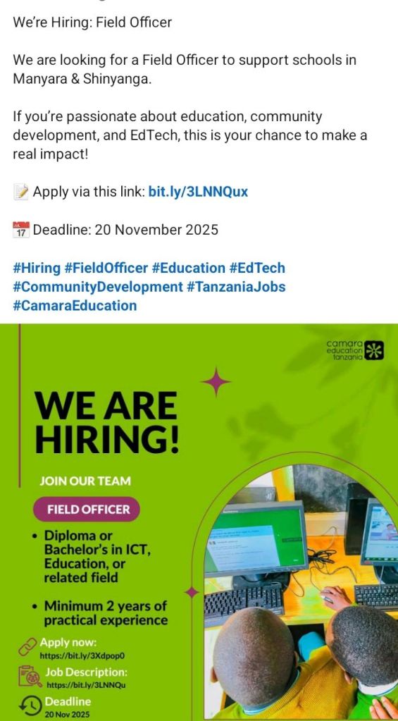 November 14, 2025 Admin Filed Officer Deadline: 20th November, 2025 Job locations: Manyara and Shinyanga View Job details and Submit application Click this link Share this: Share on X (Opens in new window) X Share on Facebook (Opens in new window) Facebook Email a link to a friend (Opens in new window) Email Share on WhatsApp (Opens in new window) WhatsApp Share on X (Opens in new window) X Like Loading...