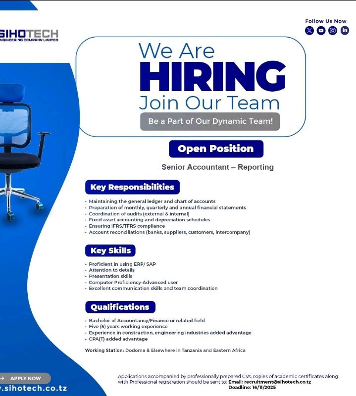 November 16, 2025 Recruiter Senior Accountant- Reporting Deadline: 16th November 2025 Discover more from Ajira Tanzania| Nafasi za Kazi Tanzania| FG Subscribe to get the latest posts sent to your email. Type your emailโฆ Subscribe Share this: Click to share on X (Opens in new window) X Click to share on Facebook (Opens in new window) Facebook Click to email a link to a friend (Opens in new window) Email Click to share on WhatsApp (Opens in new window) WhatsApp Click to share on X (Opens in new window) X Like Loading...