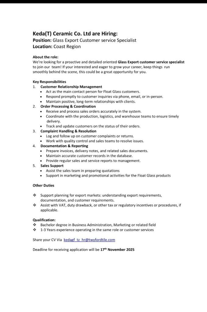 November 17, 2025 Admin Glass Export Customer Service Specialist Location: Coast region Deadline: 17th November 2025 Share this: Share on X (Opens in new window) X Share on Facebook (Opens in new window) Facebook Email a link to a friend (Opens in new window) Email Share on WhatsApp (Opens in new window) WhatsApp Share on X (Opens in new window) X Like Loading...