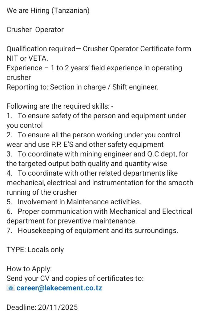 November 20, 2025 Admin Crusher Operator Deadline: 20th November 2025 Share this: Share on X (Opens in new window) X Share on Facebook (Opens in new window) Facebook Email a link to a friend (Opens in new window) Email Share on WhatsApp (Opens in new window) WhatsApp Share on X (Opens in new window) X Like Loading...