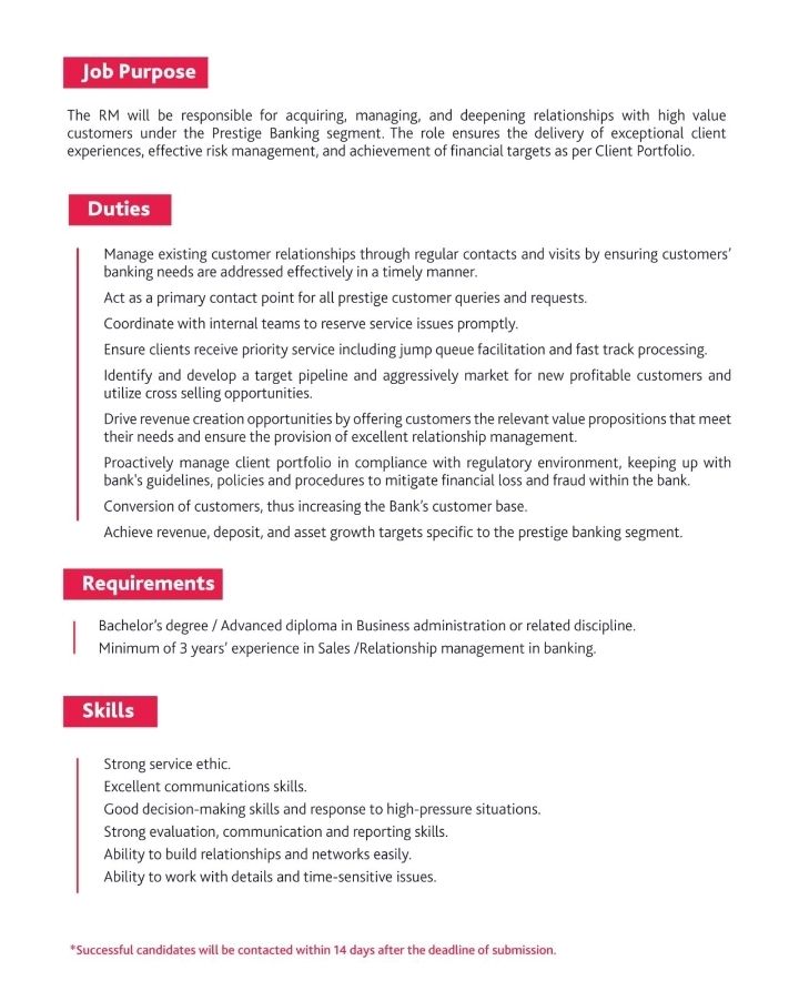 Minimum of 3 years’ experience in Sales /Relationship management in banking.