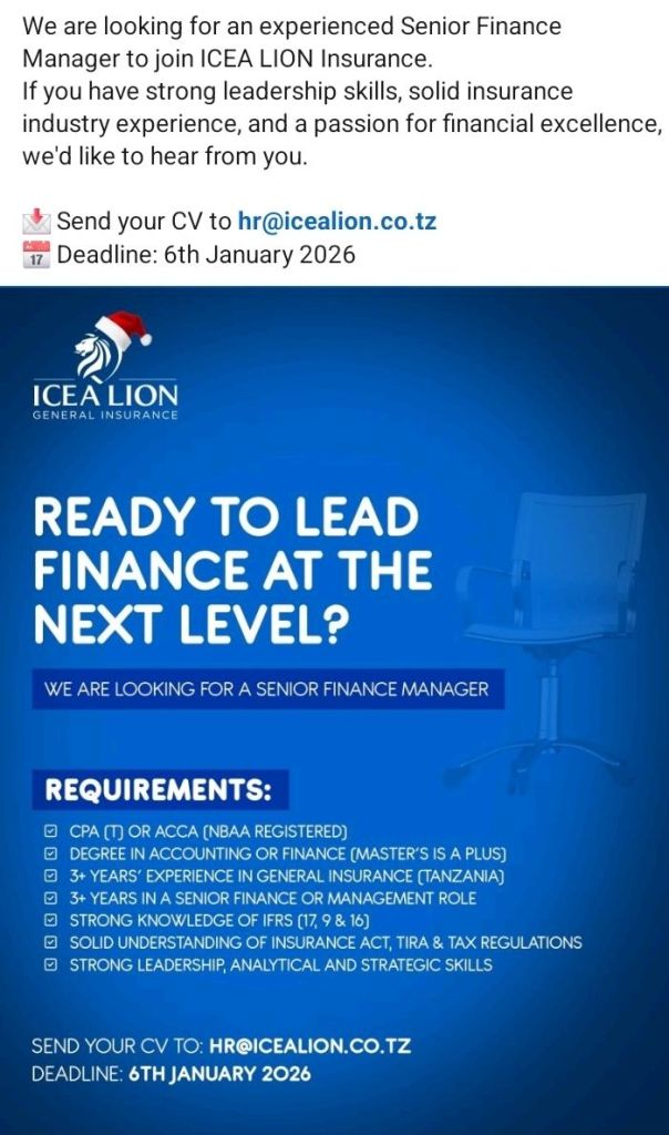 December 29, 2025December 30, 2025 Recruiter Senior Finance Manager Deadline: 6th January, 2026 Discover more from Ajira Tanzania| Nafasi za Kazi Tanzania| FG Subscribe to get the latest posts sent to your email. Type your emailโฆ Subscribe Share this: Click to share on X (Opens in new window) X Click to share on Facebook (Opens in new window) Facebook Click to email a link to a friend (Opens in new window) Email Click to share on WhatsApp (Opens in new window) WhatsApp Click to share on X (Opens in new window) X Like Loading...