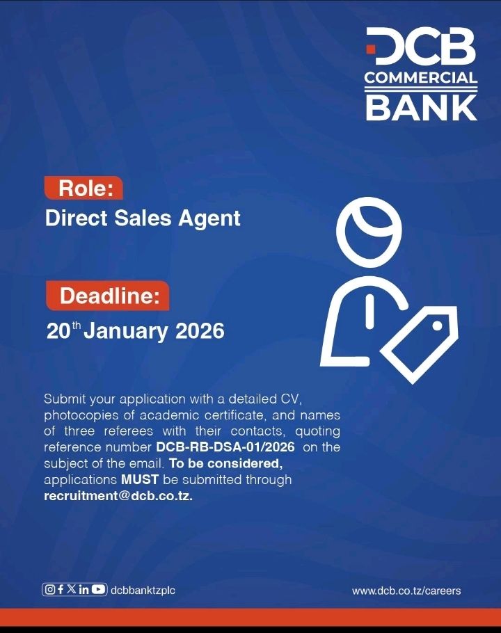 Submit your application with a detailed CV, photocopies of academic certificate, and names of three referees with their contacts, quoting reference number DCB-RB-DSA-01/2026 on the subject of the email. To be considered, applications MUST be submitted through recruitment@dcb.co.tz.
