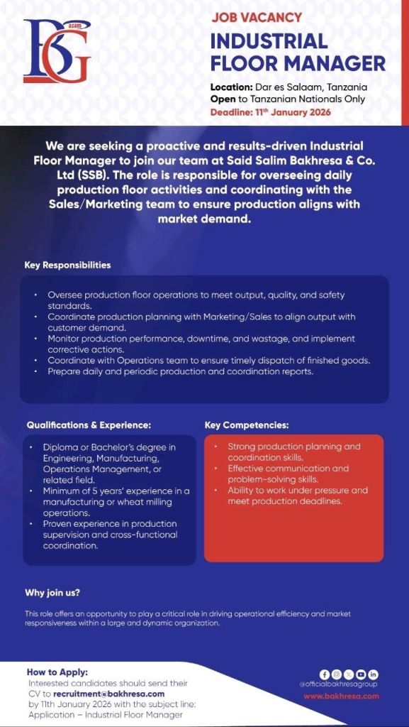 We are seeking a proactive and results-driven Industrial Floor Manager to join our team at Said Salim Bakhresa & Co. Ltd (SSB). The role is responsible for overseeing daily production floor activities and coordinating with the Sales/Marketing team to ensure production aligns with market demand.