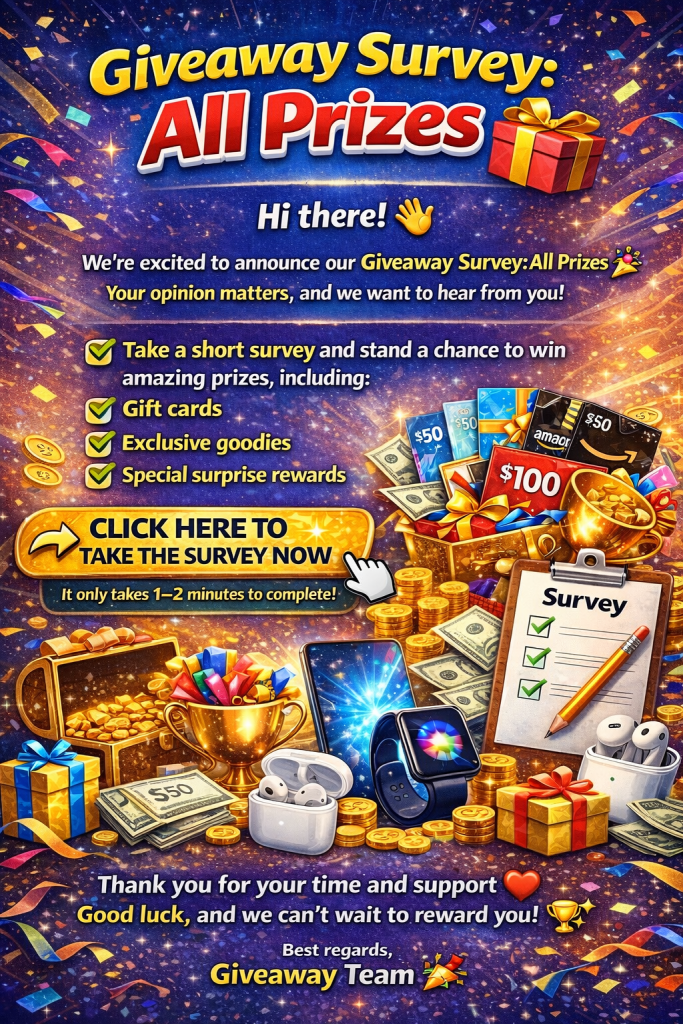 January 21, 2026 Admin Giveaway Survey: All Prizes 👉 Click here to take the Survey Share this: Share on X (Opens in new window) X Share on Facebook (Opens in new window) Facebook Email a link to a friend (Opens in new window) Email Share on WhatsApp (Opens in new window) WhatsApp Share on X (Opens in new window) X Like Loading...