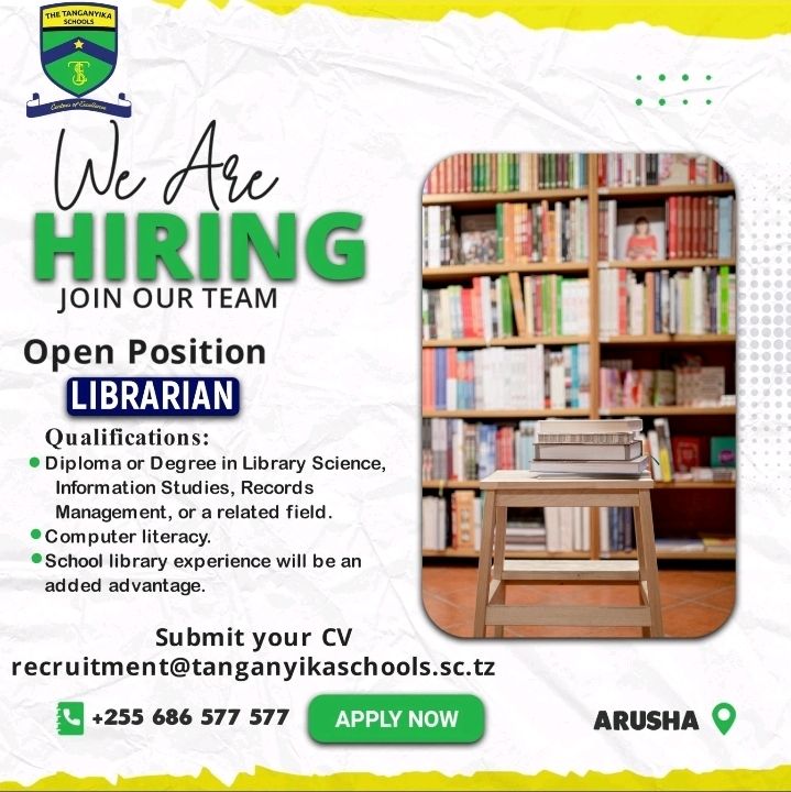 January 27, 2026January 26, 2026 Admin Vacancy: Librarian * Job location: Arusha We Are HIRINGJOIN OUR TEAM atOptions = { ‘key’ : ‘addaafd569db95f48ecf2df8c942dd7e’, ‘format’ : ‘iframe’, ‘height’ : 60, ‘width’ : 468, ‘params’ : {} }; https://www.highperformanceformat.com/addaafd569db95f48ecf2df8c942dd7e/invoke.js Qualifications:• Diploma or Degree in Library Science, Information Studies, Records Management, or a related field.• Computer literacy.• School library experience will be an added advantage. Submit your CVrecruitment@tanganyikaschools.sc.tz 📞 +255 686 577 577 APPLY NOW 📍 ARUSHA atOptions = { ‘key’ : ‘addaafd569db95f48ecf2df8c942dd7e’, ‘format’ : ‘iframe’, ‘height’ : 60, ‘width’ : 468, ‘params’ : {} }; https://www.highperformanceformat.com/addaafd569db95f48ecf2df8c942dd7e/invoke.js Share this: Share on X (Opens in new window) X Share on Facebook (Opens in new window) Facebook Email a link to a friend (Opens in new window) Email Share on WhatsApp (Opens in new window) WhatsApp Share on X (Opens in new window) X Like Loading...